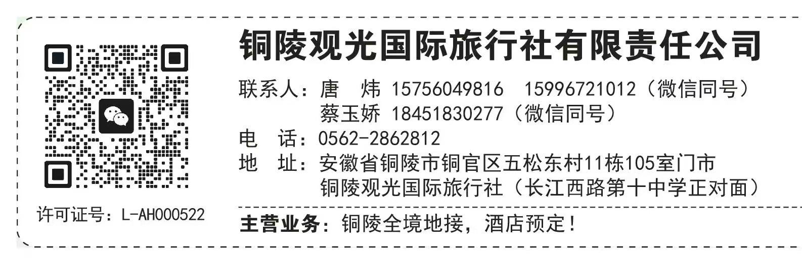 Tongling sightseeing tourism travel limited liability company is the provincial, city tourism board for approval, pay the quality margin, the Bureau of industry and commerce registration, specialized in tourism services has an independent legal personality of tourism enterprises. The reception of Chinese citizens domestic tourism, outbound tourism business consulting agency, set around the domestic sales agents domestic air tickets, hotels, tourism product sales run.